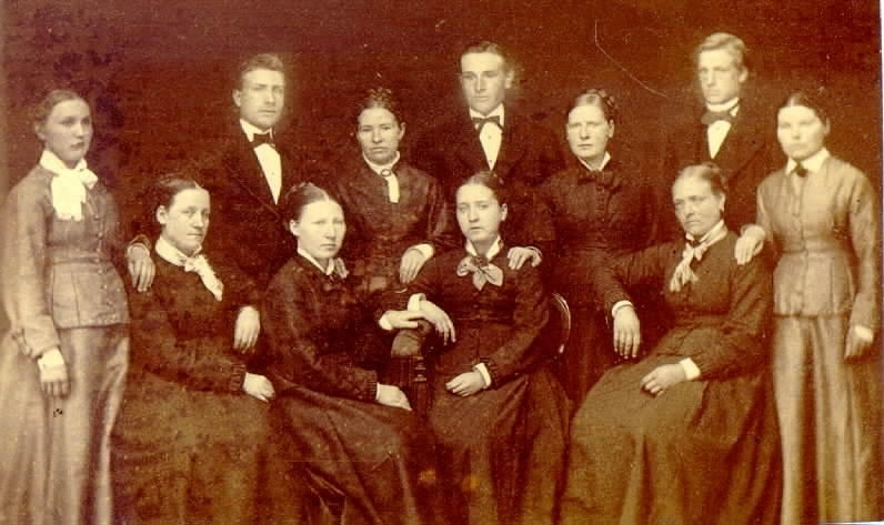 Nr. 3 stående fr. höger: Mathilda Bogren, nr. 2 fr. v. Frank Bogren, och till höger Carl Fast. Frank Bogrens hustru och syster Selma sittande snett framför honom.