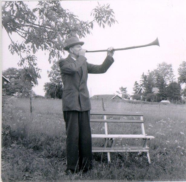Ålderman f.d. lantbrukare Erik Darius blåser i lur.