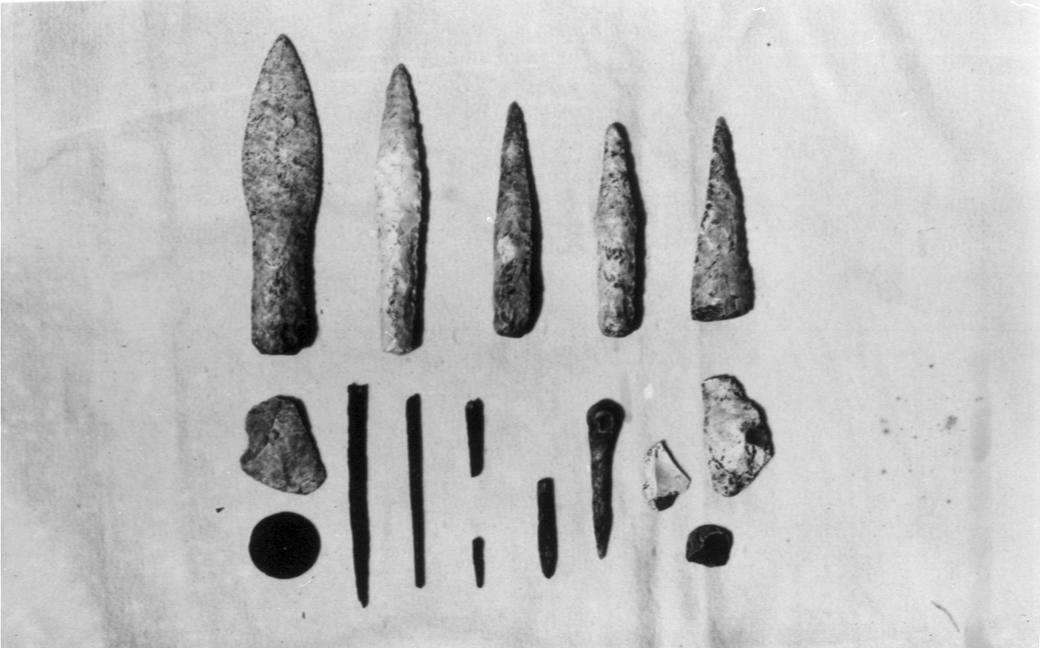 Fynd i hällkista. Spjutspetsar, bennål, flintavslag m.m.