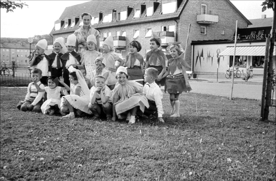 Utklädda barn, affären Blå Vinkeln i bakgrunden.