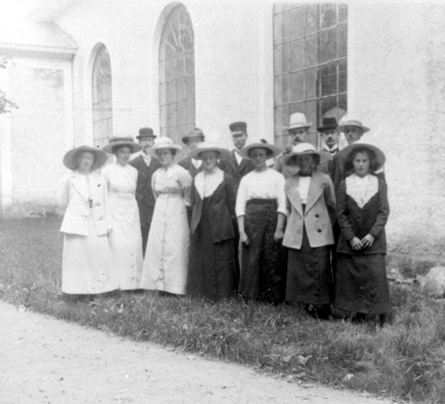 Sångare utanför Floby kyrka. Främre redan 2) Gerda Båge 4) Hildur Gustavsson från Lillegården 5) Hildur Samuelsson. Bakre raden 3) Karl Andersson Istorp 4) Hjalmar Nilsson 5) Artur Nilsson 6) Oskar Andersson Ledsgården.