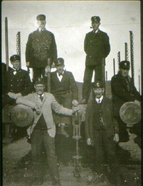 Järnvägen. Gruppfoto omkring 1918.Stående fr.v. Axel Smedberg och Nytting.Sittande fr.v. 1. ?, 2. ? 3. J. Petterson (Alingsåspetter). Längst fram fr.v. Flood.