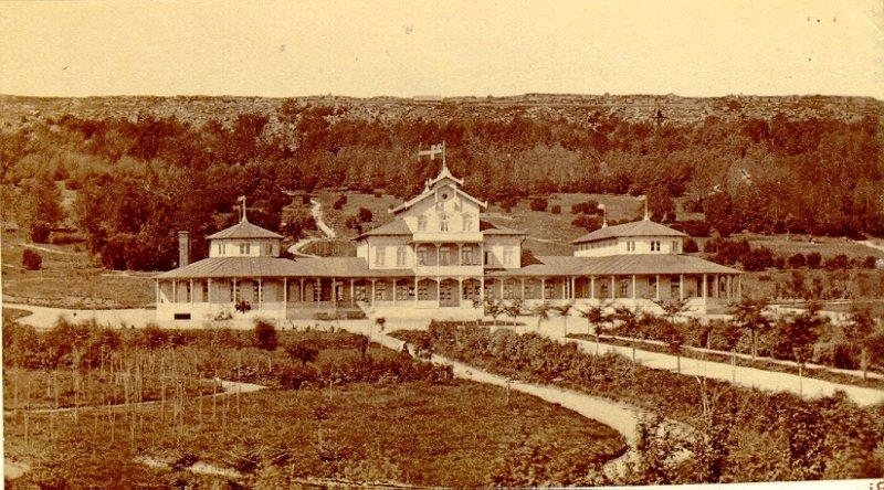Mössebergs bad. Societetshuset. När badhuset på Mösseberg brann ned på 1870-talet uppfördes detta nya. Träden i allén är här små.