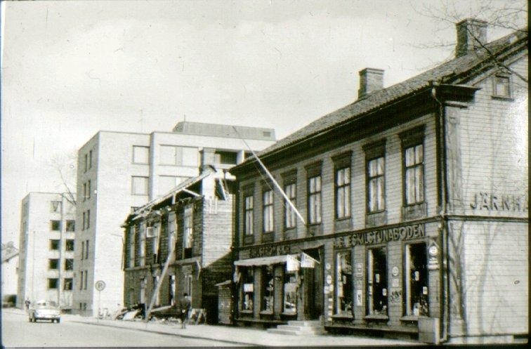 Kv. Hinden, Järnvägsgatan 18-20. Gamla Telegrafen och Eskilstunaboden strax före rivningen.
