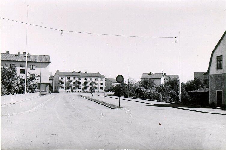 S:t Sigfridsplatsen. Foto från söder på S:t Sigfridsgatan. Byggnaden till vänster S:t Sigfridsgatan 42 bakom träden S:t Sigfridsplatsen 1. Mellan träden och byggnaden är nu fontänen.