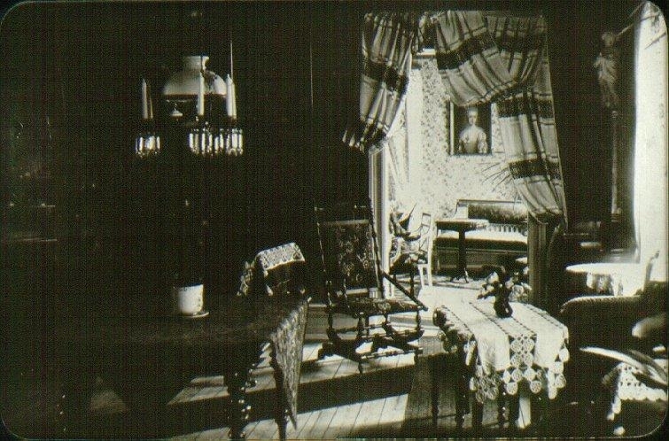 Interiör, Warenbergs hem (Tyskatomten). Förmaken sett från salen. Taget 1902 före auktionen. Fotografen har stått framför tamburdörren. På tamburen var en balkong. Drottningtavlan hänger på ytterväggen till Ekmans gränd. Det vita broderiet bakom gungstolen hör till en stor duk som täcker taffelpianot. Detta forslades på landsväg från Stockholm. Otto Warenberg var en mycket god vissångare. Otto Warenberg född 1839, död 1902. Helga Warenberg född 1843, död 1899. Arvinge:Karl Alfred Warenberg, f. 24/7 1878.