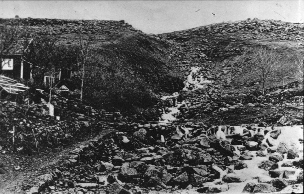 Mösseberg, Bestorpsbäcken vid nuvarande Halvorsens. Huset ägdes av Halvorsen. Mösseberg är det "kala" berget. Bäcken rann från Pankasjön (Skogssjön). Foto från sekelskiftet.
