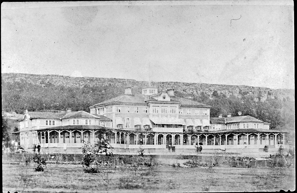 Mössebergs sanatorium, gamla badhuset, som brann 1870. I översta våningen bl.a. betjäningens rum, en man och en kvinna innebrändes. Gåva från fotograf Ögrens samlingar.