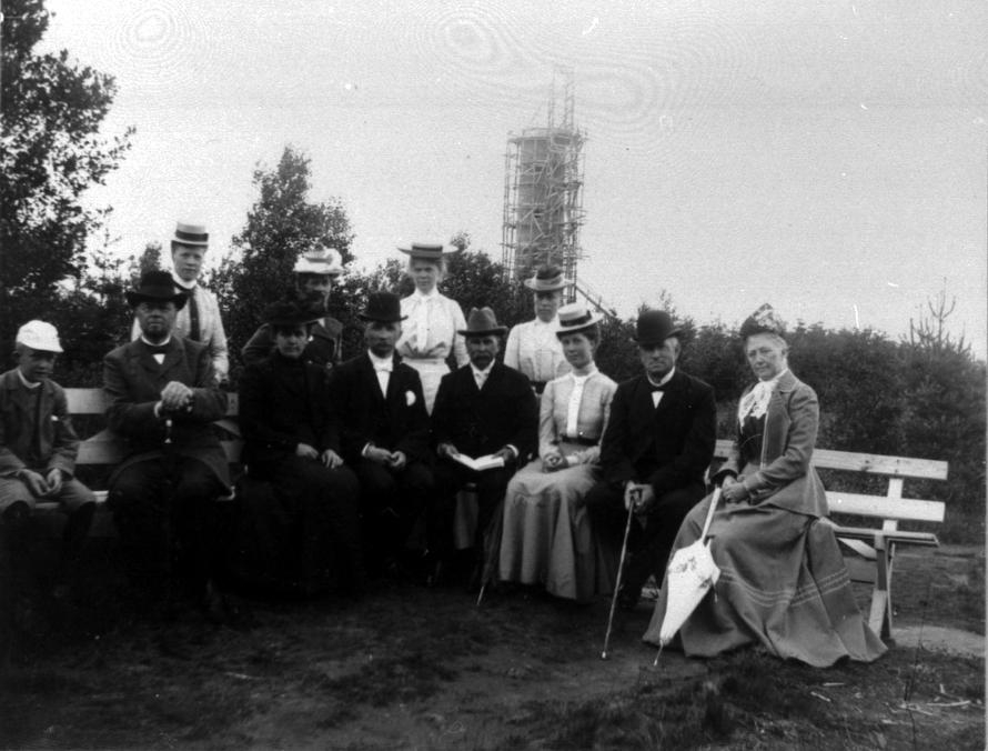Bilden tagen på Mösseberg vid tiden för byggandet av utsiktstornet. John och Gerda Sundler är de sittande nr. 3-4 fr. vänster.