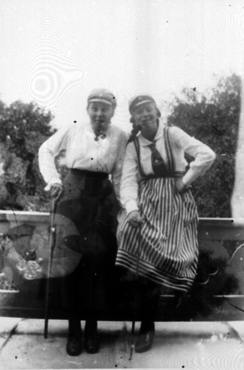 (uppgifter saknas) Två unga män utklädda till kvinnor.