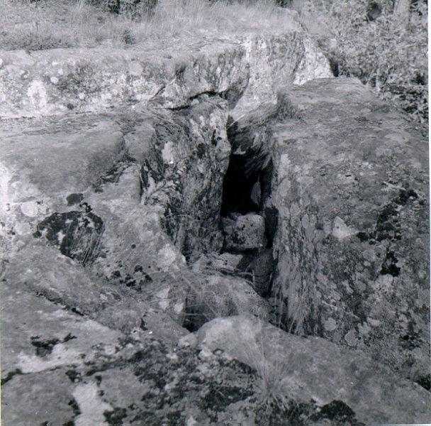 Titel: Tjuvahålan vid Tjuvadalen, Stommen Hällestad. Sprickbildning i berg där stenar bildar en grotta eller håla.