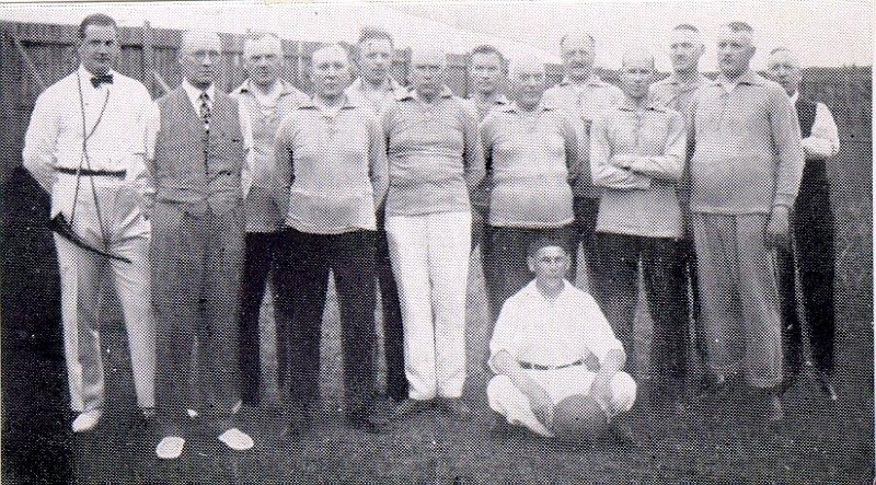 Stadsfullmäktiges fotbollsmatch 1934. Nr.1. okänd. 2. Frey Hammarstrand, landsfiskal, 3. Klein, tågmäst.4. Karl Plith, köpman, 5. Mats Olsson, överbanmäst. 7. Gunnar Rane, tandläk. 8. Karl Johan Wiberg, köpm. 9 E.P. Vrang, red.10. Ivar Nilsson, ing. 11. okänd, 12. Einar Jonzén, köpman, 13. okänd. Bollman Teofild Felt, fattigvårdstyrelsens ordf.
