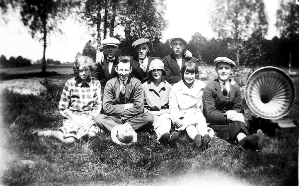 Alrik Johansson med trattgrammofonen + släktingar och goda vänner vid Ryttaren Sandhem.