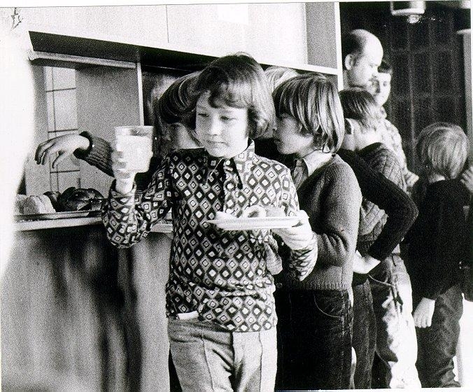Utspisning i Gudhems skola, troligen vid någon orienteringstävlan. Längst bak syns Henry Johansson, Gudhem. Uppgift John Edström, kamrer i Torbjörntorp.