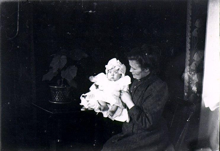 Fotot taget i Baggekvarn, Solberga. Personer: Mjölnarhustrun Anna Andersson, född Johansson, 1882 i Aspelund, Yllestad, död 1936, samt hennes son Anton Andersson/Warrén, född 1910, sedan boende i L. Ormaslätten, Yllestad.