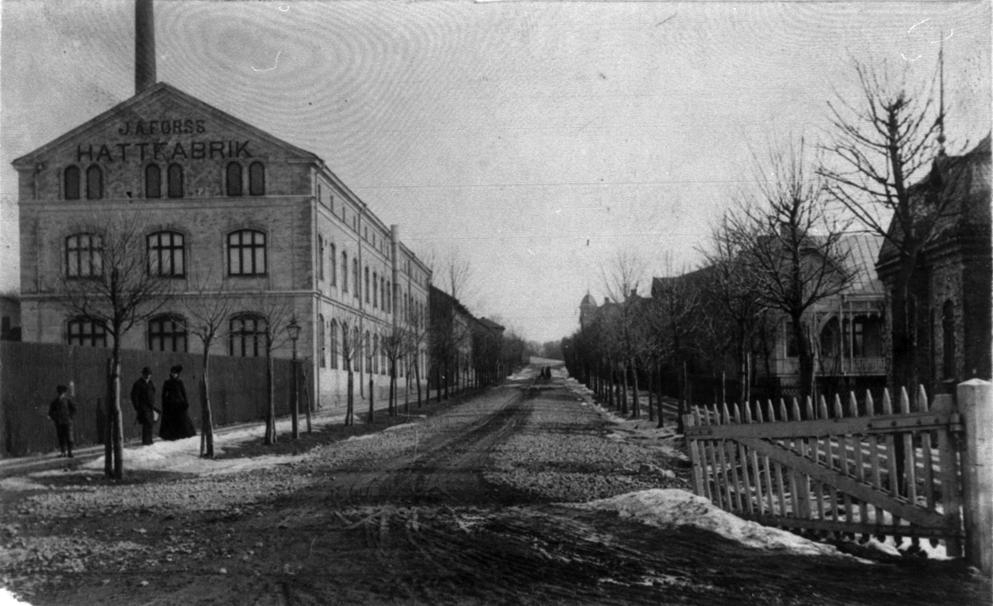 Vy över Nya Trädgårdsgatan österut, omkr. sekelskiftet. Forss hattfabrik t.v.