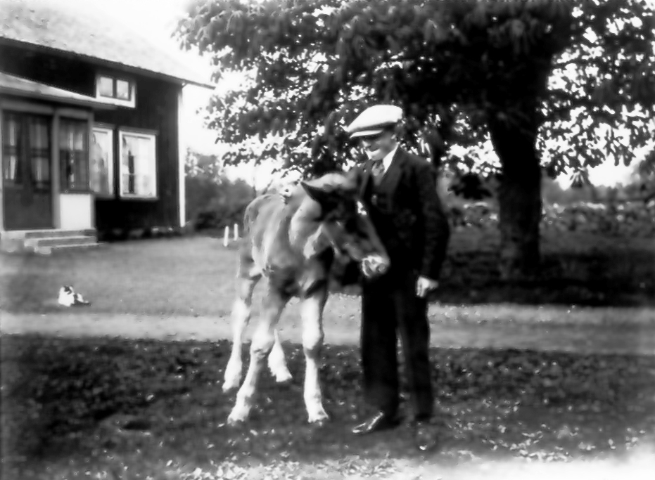 Verner Öhrnell med den flaskuppfödda fölungen. Vårdträdet är en kastanj.