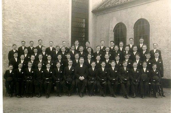 Konfirmander 1935. Sittande från vänster: I. Persson, Rolf Gannemark, K.A. Josefsson, Harry Friberg, Arne Jonsson, Rune Jonsson, Gillis Claesson, Prosten Fritz Wetterholm, Gösta Johansson, Björn Eriksson, Alf Johansson, Nisse Hall, Stig Johansson, Yngve Grehn, Bertil Liberg. Andra raden från vänster: K.E. Gustavsson, Rolf Johansson, Bengt Nilsson, Östen Johansson, Lundell, Stellan Melin, Åke Karlsson, okänd, okänd, Erik Jakobsson, Ingemar Törnkvist, H. Johansson, Olle Holgersson, Arnold Andersson. Tredje raden från vänster: Jan Wallin, Per Wallin, Karl-Erik Sandberg, Herbert Johansson, Tore Hindricks, Elmered - tidigare Johansson, Erik Grahn, John Andersson, Gunnar Svärd, Tage Isaksson, Karl-Erik Rytting, Gösta Oskarsson, K.E. Pettersson, Åke Dahlin, Rune Palmkvist, George Jansson. Övre raden från vänster: Valter Flobäck, Sven Frimansson, Valter Johansson, okänd, Lennart Andersson, Ingemar Lundahl, Sven Ljungström, Karl-Erik Josefssson, Karl-Erik Norén, Anders Heriberts, Rune Käll, Bengt Setterberg, Stig Karl