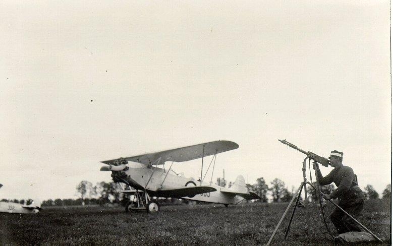 Från fälttjänstövningarna vid Falköping 1931. Flygmaskin och kulsprutegevär.