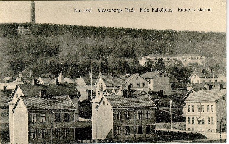 Mössebergs bad. Från Falköping - Rantens station. Mot Bredablick, utsiktstornet och Mössebergs bad från Rantens torg med Döbelnsgatan.