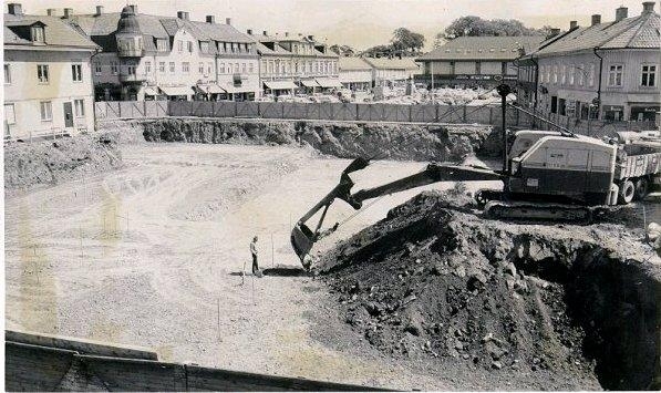 Grävning för grund och källarplan till nya bankhuset vid stora torget våren 1973. 1:a November samma år var gjutningen av källarplanet igång. Bild mot Stora torget.
