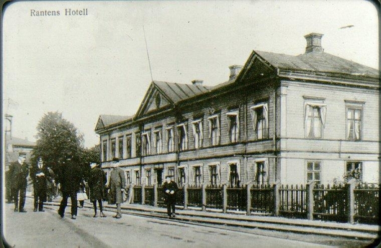 Rantens hotell åt bangården, med bl.a. järnvägstjänstemän på perrongen.