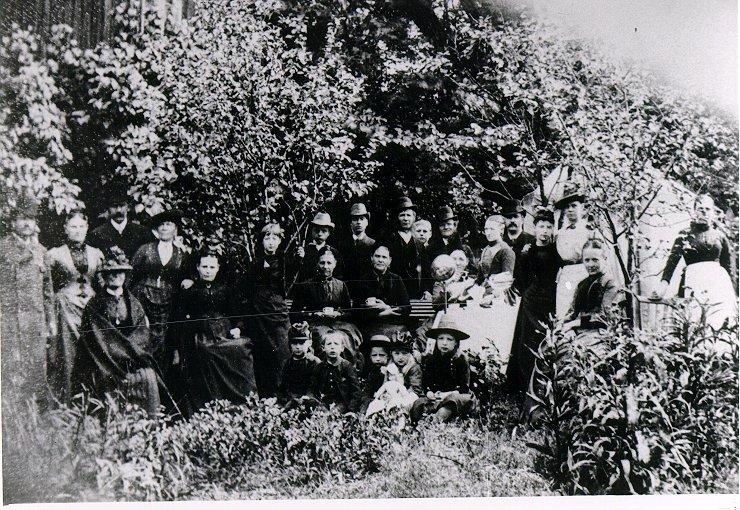 Ett kafferep i en hantverksmästares idylliska trädgård. Längst till vänster står fabrikör Forss.