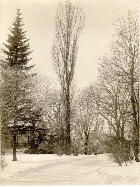 Lasarettsparken. Pilen i mittbilden togs bort före 1919. Granen följde samma öde i början av 1940-talet. Byggnaden till höger kallades Gula Paviljonen.