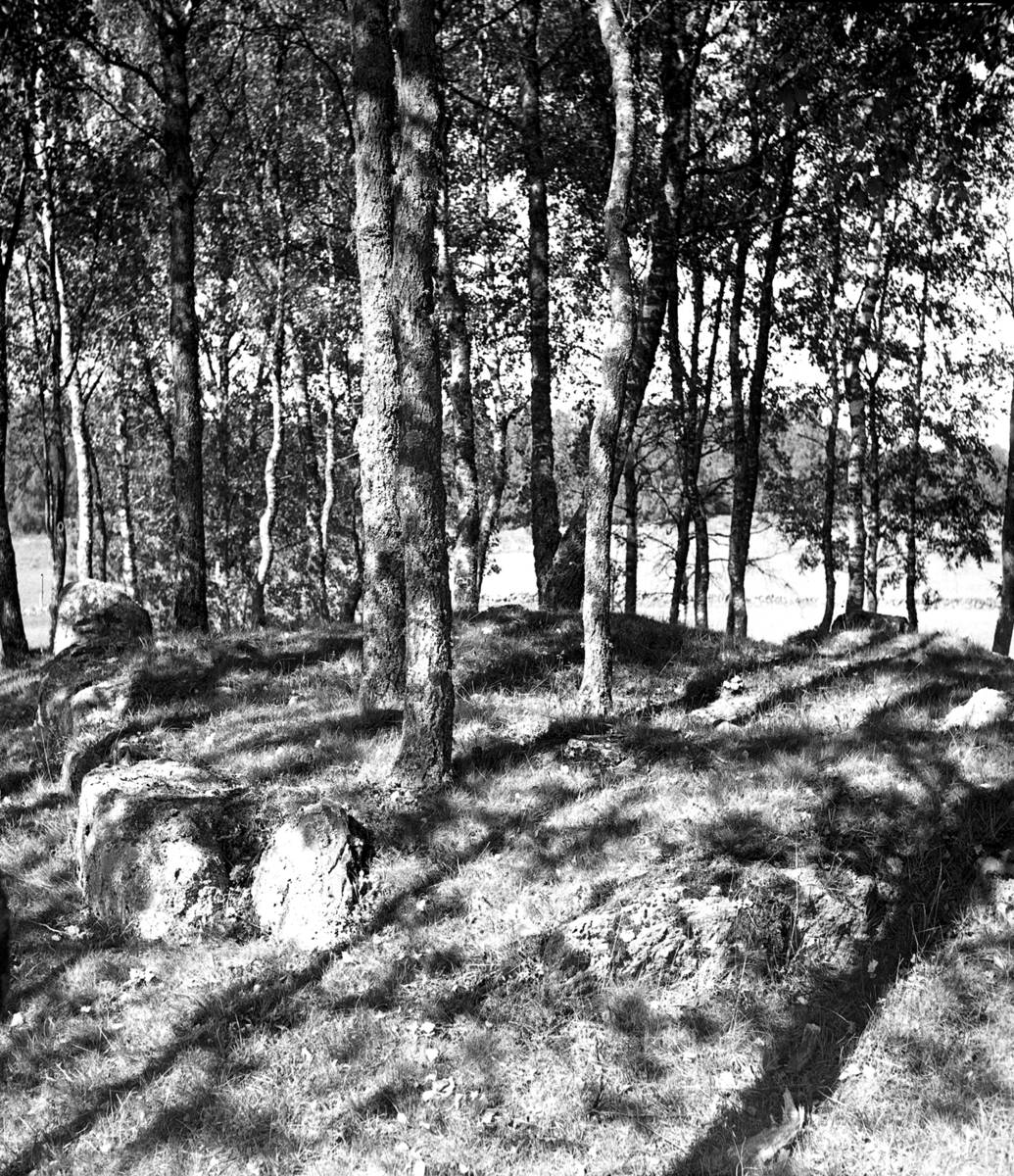 Fyrkantsröse på ängsmark på en hög ås, ca 300 m oso om gården. Bilden tagen från en skålgropssten strax sv därom. Nr 32 i H Svenssons inventering, 1951.