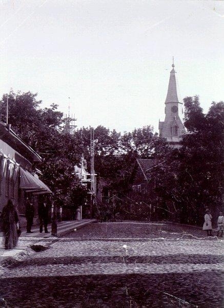 Kv. Klockaren 1, Storgatan 13, Kilanders. Kilanderska huset under byggnad. Färdigbyggt år 1900. Då inflyttade även postkontoret där från det lilla huset till vänster (se brevlådan på väggen) med ingång från gårdssidan. Postmästare var postexpeditör fru Maria Hammarstrand. I hörnet av Storgatan mellan Kilanders och lilla huset t. vänster låg poliskonstapel Högbergs låga envåningshus (ett stycke in på tomten), där sedan uppfördes hörnhuset inrymmande bokhandel, Skaraborgsbanken m.m. Till höger Jouvins hotell, och närmast kyrkan Westlins hus, där Kilander i många år hade sin manufakturaffär, tills hans nya hus blev färdigt.
