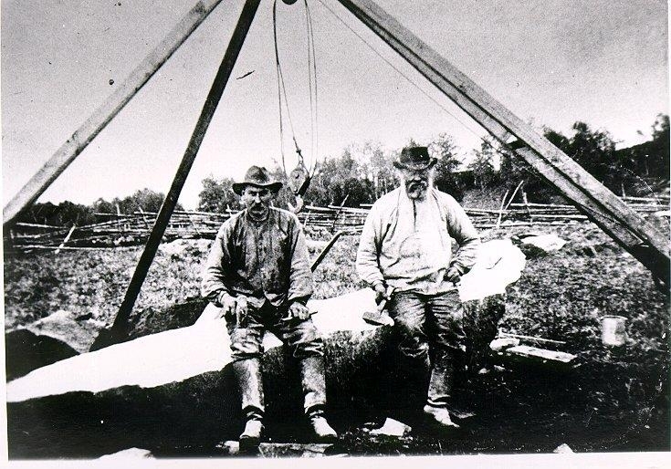 Mårten och Eka Klas. Stenblock upphissat med hjälp av block och talja.