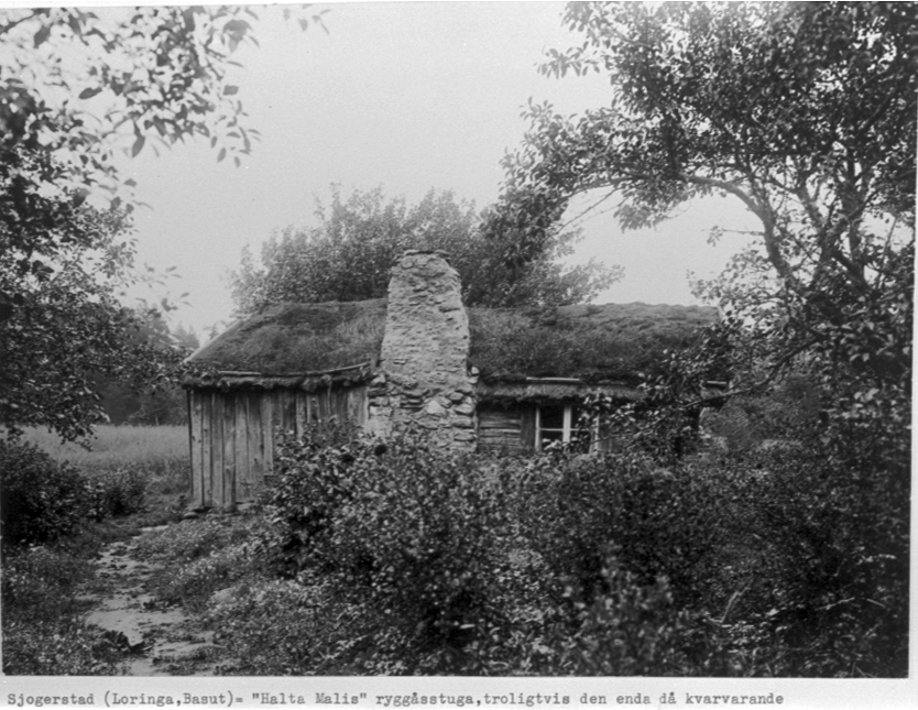 Sjogerstad (Loringa, Basut). "Halta Malis" ryggåsstuga, troligtvis den enda då kvarvarande med skorstenspipan murad utanför huset.