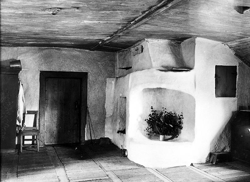 Interiör av gammal bondgård från Dalum med den stora spiseln med "gruva" och "åmbänk".