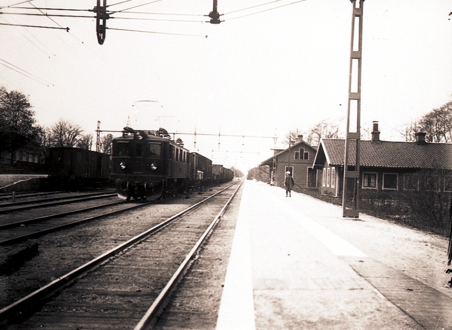 Titel: Järnvägsstationen, Floby, efter elektrifieringen. Stationen och stinsbostaden. Loket på bilden är ett D-lok, möjligen det första sådant som passerat Floby.