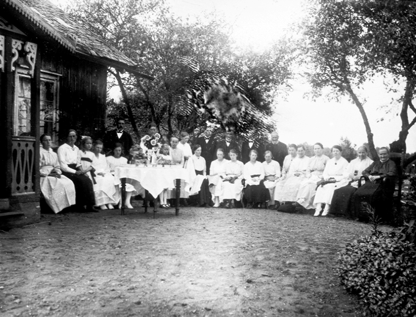 Möjligen ett syföreningsmöte. I bakre raden står Artur i sulevad, Oskar och Edvin Floberg.