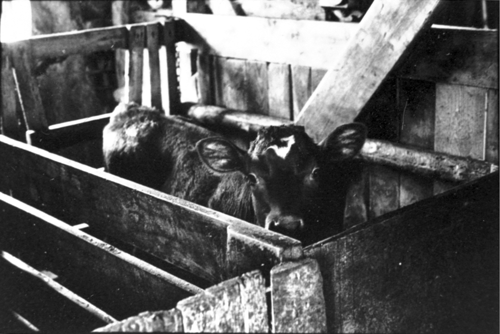 Bossgården. Fähuset med djurbestånd. De små fönstren ger skum belysning.