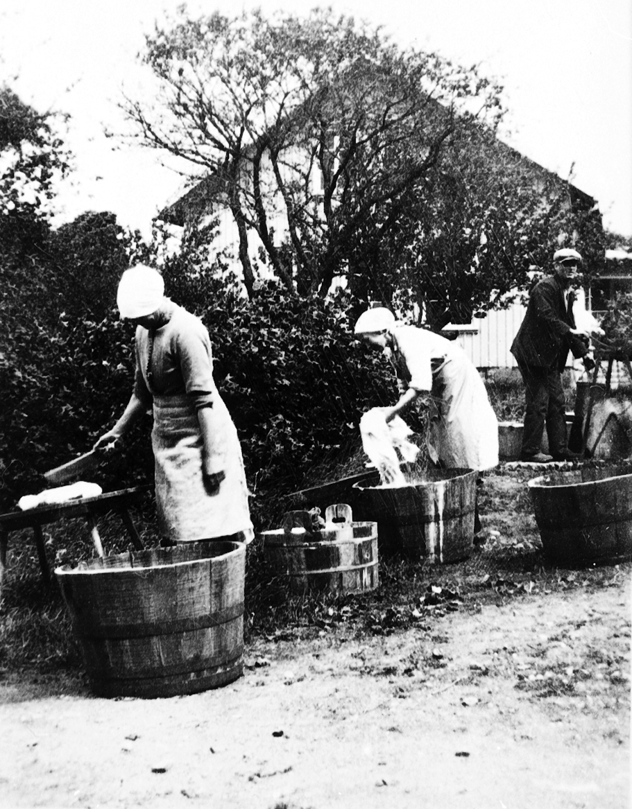 Hällestads skola. Anna och Ester Johansson, Erik Hagelin vid pumpen.