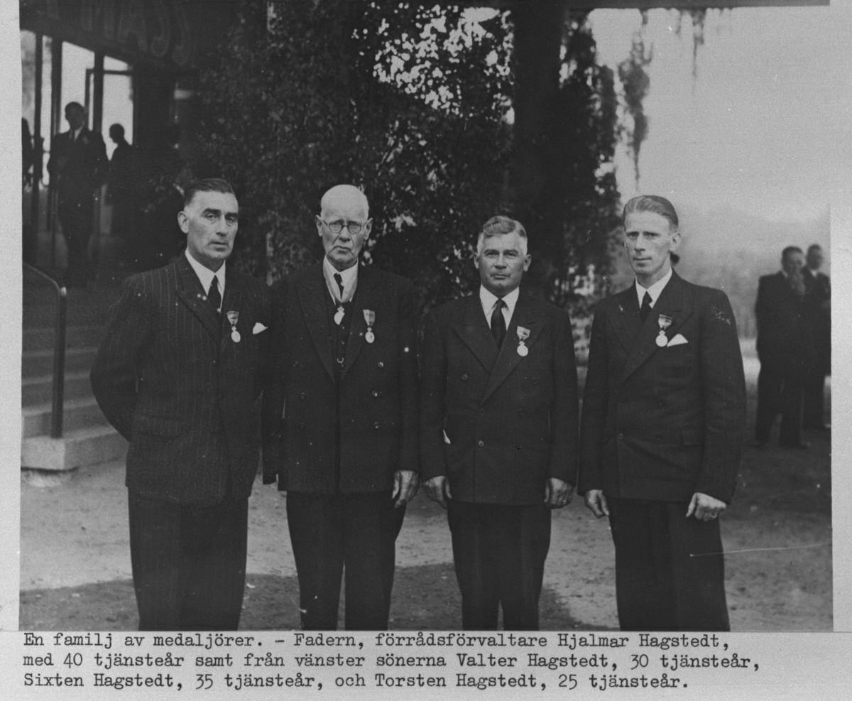 En familj av medaljörer. - Fadern, förrådsförvaltare Hjalmar Hagstedt, med sina 40 tjänsteår samt från vänster sönerna Valter Hagstedt, 30 tjänsteår, Sixten Hagstedt, 35 tjänsteår och Torsten Hagstedt, 25 tjänsteår.