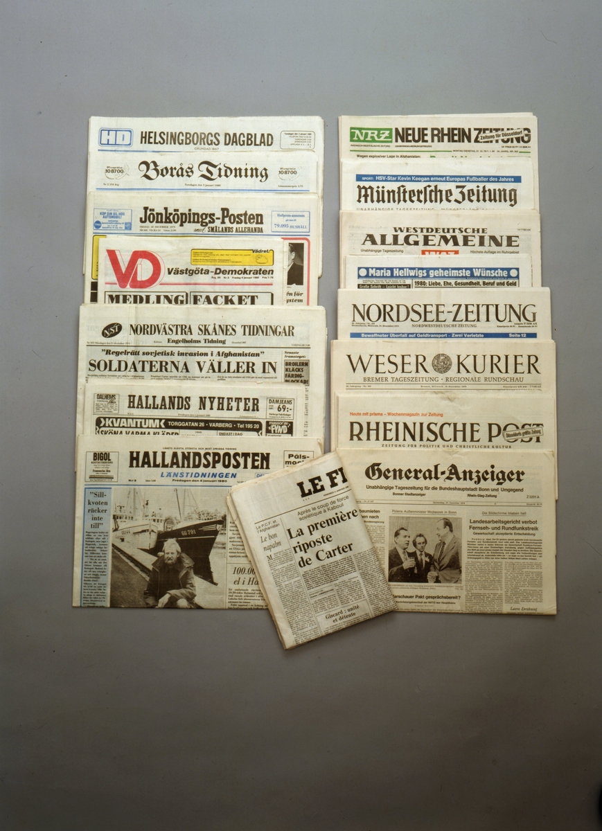 Tidningar tryckta på papper från Hylte. Fotografi för Papyrus åsberättelse 1979.