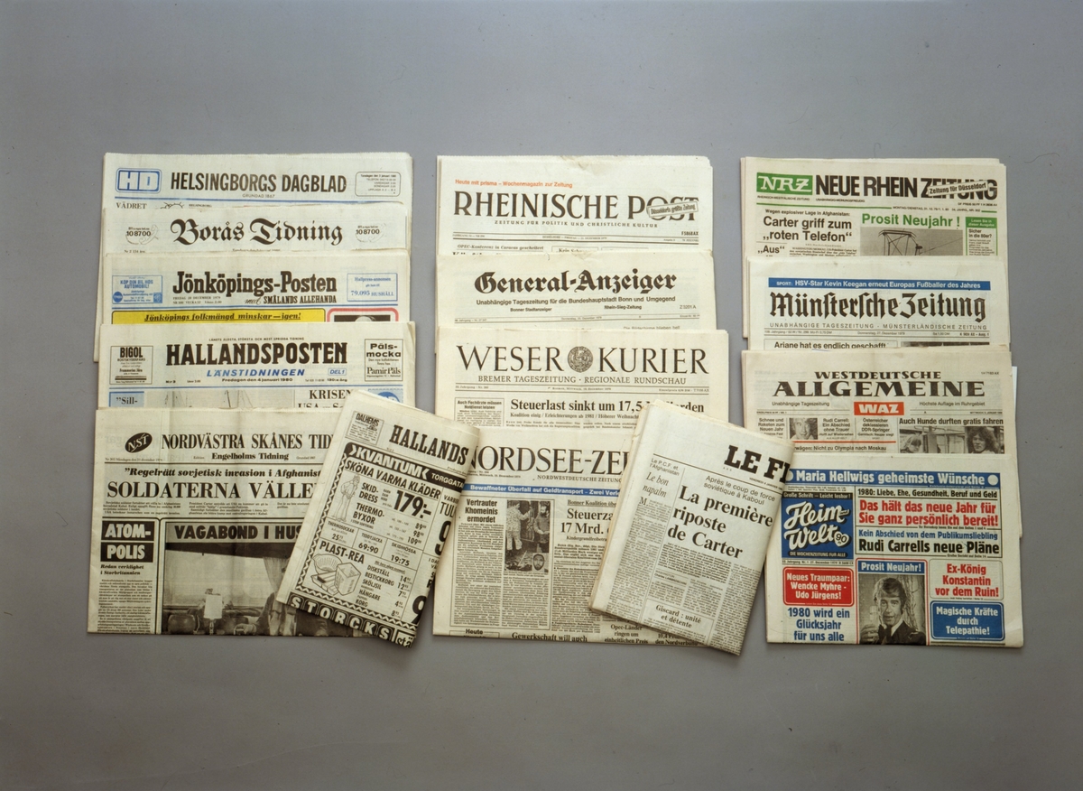 Tidningar tryckta på papper från Hylte. Fotografi för Papyrus åsberättelse 1979.