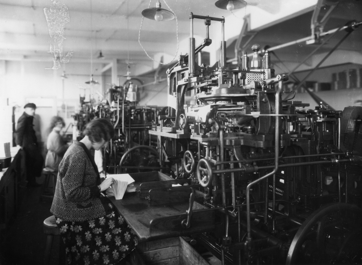Två kvinnor och en man arbetar vid kuvertmaskiner på Papyrus.