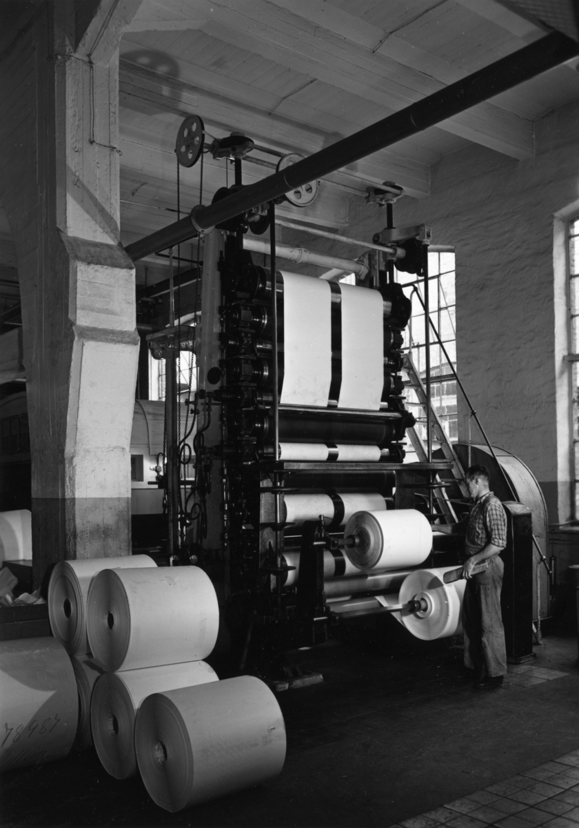 En man arbetar vid maskinen Glätt nr. 2 på Papyrus.