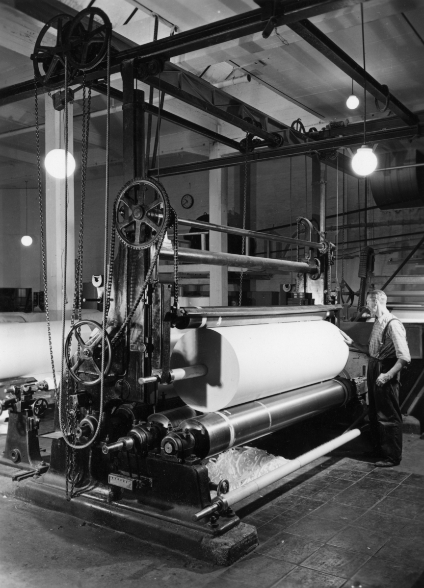 En man arbetar vid rullmaskin nr. 9 på Papyrus.
