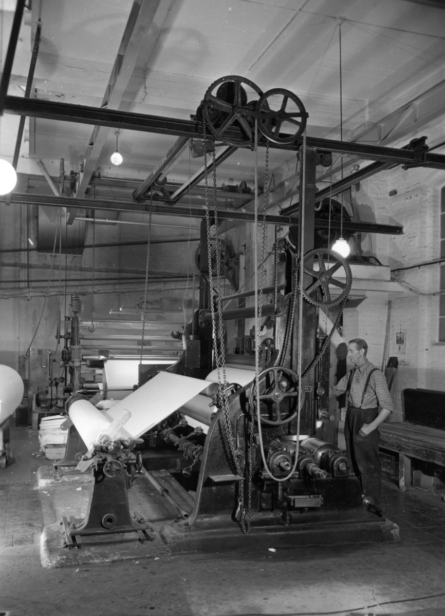 En man arbetar vid rullmaskin nr. 9 på Papyrus.