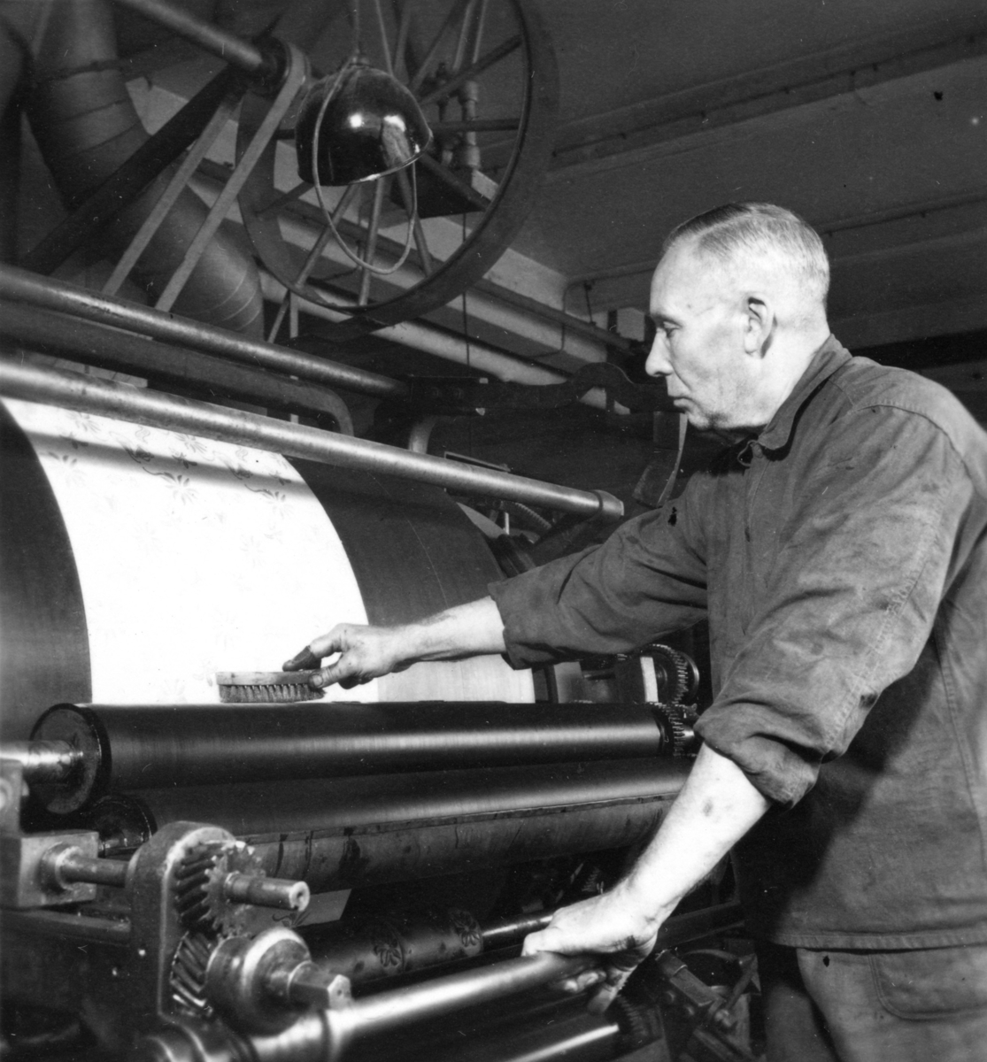 En man arbetar vid tryckmaskinen, mönster "Flocamaskinen" på Papyrus.