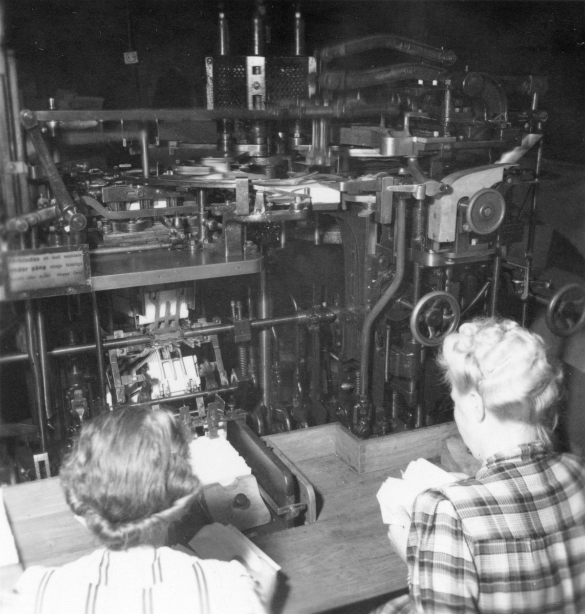 Två kvinnor arbetar vid en kuvertmaskin på Papyrus.
