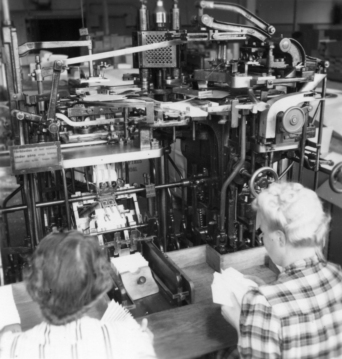 Två kvinnor arbetar vid en kuvertmaskin på Papyrus.