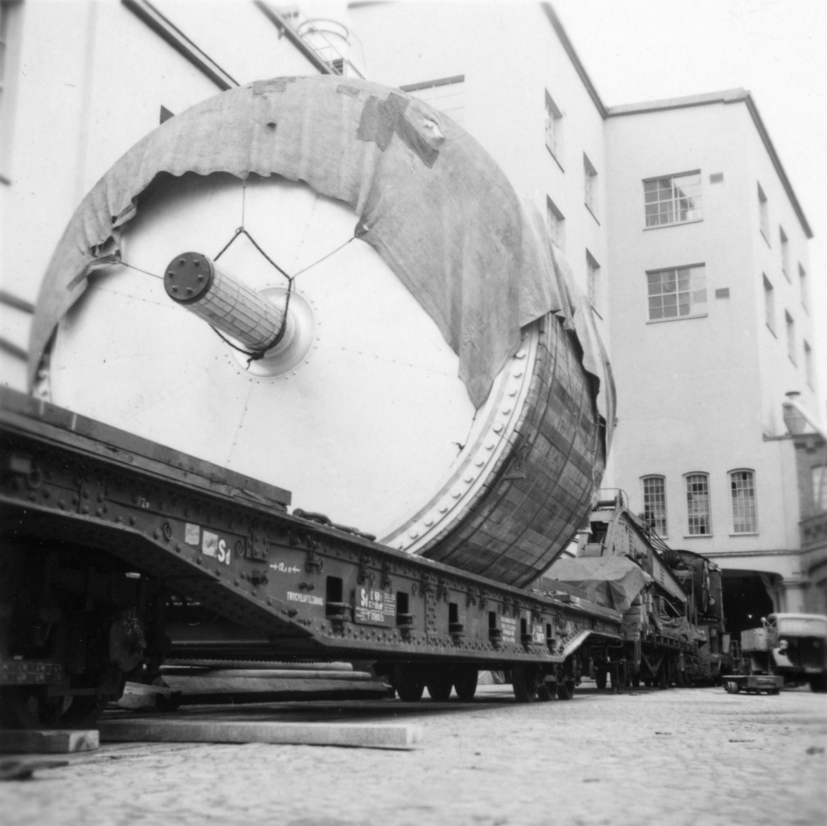 Titel: PM 3 Yankeecylindern lyfts in i fabriksbyggnaden på Papyrus område. Transport av SJ:s katastrofkran??