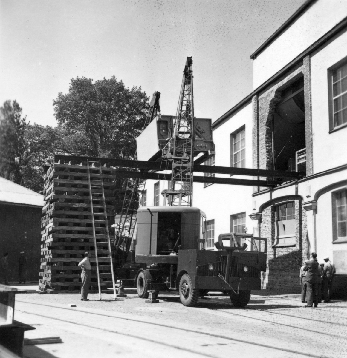 Titel: PM 3 ?? av maskindelar på Papyrus fabriksområde. Några män är med på bilden.