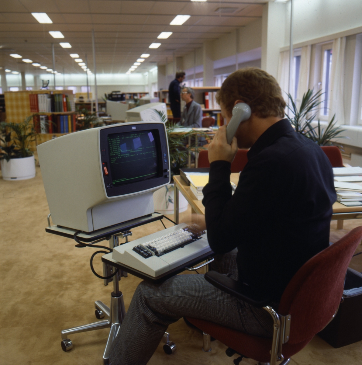 Titel: Pappersgruppen, kontoret, Region Väst, dataskärm. Hösten 1982.